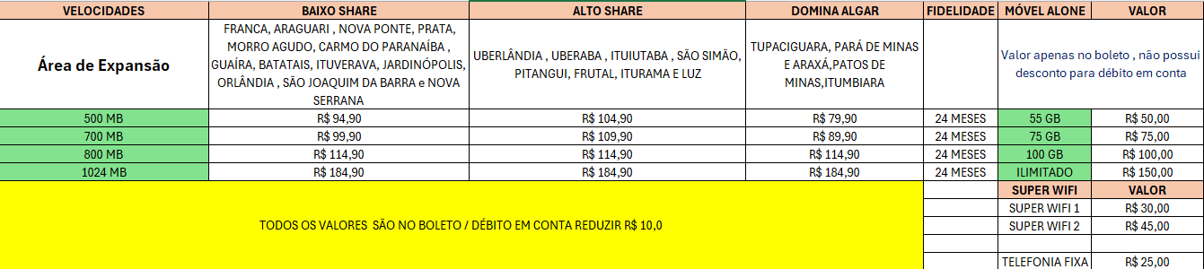 | TODOS OS VALORES SÃO NO BOLETO / DÉBITO EM CONTA REDUZIR R$ 10,0 | SUPER WIFI | VALOR | ||||